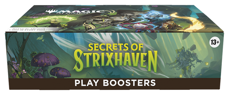 The hallowed halls of Strixhaven welcome you back to school! Choose your college of magical study and expand your education in the greater world of Arcavios. Uncover ancient battlefields, monstrous mires, and mind-bending architecture as you stand against the mysterious threats plaguing the plane. This Secrets of Strixhaven Play Booster Box containing 30 Play Boosters, perfect for both Limited play and opening packs just for fun. Each Play Booster includes 1–5 cards of rarity Rare or higher (2: 33%; 3: 6%; 4–5: <1%), and 3–6 Uncommon, 5–8 Common, and 1 Land cards. 1 card of any rarity is Traditional Foil. Foil Borderless Mythic in <1% of boosters. Traditional Foil Land replaces a Land in 20% of boosters.